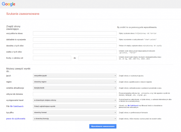 Formularz „Szukania zaawansowanego” pozwala jeszcze bardziej zawęzić wyniki wyszukiwania. Aby z niego skorzystać wystarczy przejść na stronę: www.google.com/advanced_search