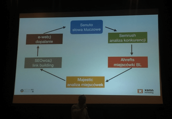 Tomasz w ciągu 15 minut zaprezentował, jak podchodzi do analizy haseł, określa konkurencję, a przy tym pokazał narzędzia, z których korzysta na co dzień. Wspomniał o architekturze informacji w serwisie i doborze słów kluczowych względem niej, a także przedstawił swój sposób na wybór źródeł back linków, wykorzystując dwa popularne narzędzia Ahrefs i Majestic SEO. Na koniec z humorem wspomniał o e-weblinku, z którego korzysta do indeksowania swoich odnośników oraz tzw. „dopalania miejscówek”, czyli sposobu na wzmocnienie wartości danych serwisów.