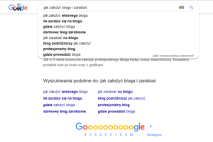 Spróbuj wpisać w wyszukiwarce słowo kluczowe najtrafniej opisujące temat wpisu na blogu. Uzyskasz w ten sposób listę artykułów, z którymi przyjdzie Ci konkurować w wynikach organicznych oraz gotowy zestaw fraz kluczowych do wykorzystania. Znajdziesz go w podpowiedziach od Google, jak i na samym dole strony, w sekcji “Wyniki podobne do…”.