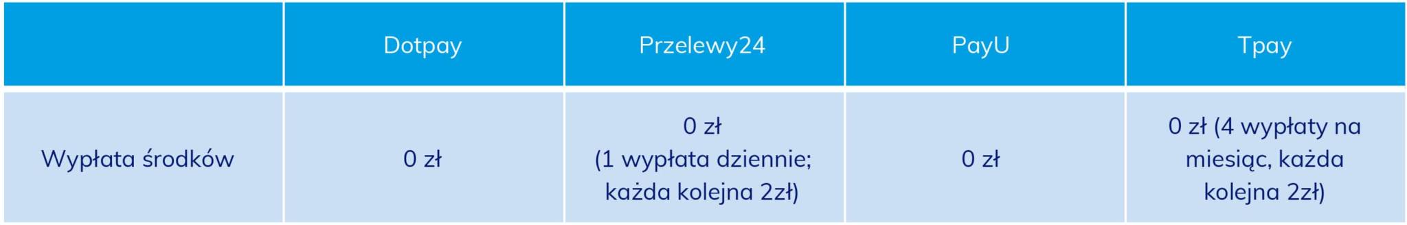 Nawiązując współpracę z systemem płatności, uzyskasz dostęp do konta przejściowego, na którym będą gromadzone środki wpłacane przez klientów e-sklepu. Aby skorzystać z tych pieniędzy, musisz najpierw zlecić wykonanie przelewu na konto Twojej firmy. Taka usługa jest przeważnie darmowa, jednak niektórzy operatorzy pobierają prowizję przy przekroczeniu konkretnej liczby transferów w danym dniu lub miesiącu. Sytuacja wygląda nieco inaczej w przypadku wypłaty środków na zagraniczne konta, więcej informacji na ten temat znajdziesz w poniższej tabeli.