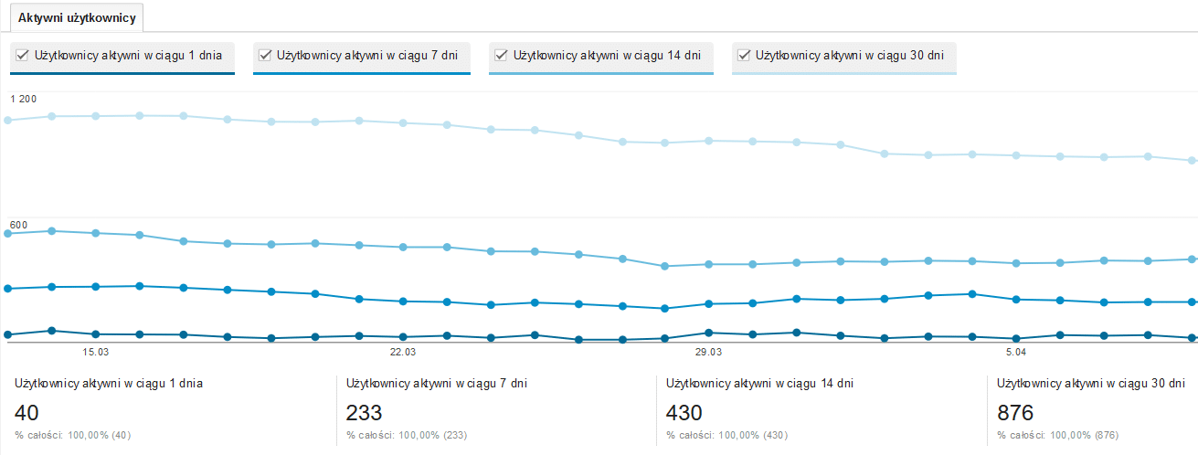 Dane przedstawione na wykresie w czytelny sposób pokazują, czy nasze działania marketingowe ściągają zakładaną liczbę użytkowników na stronę. Nagły spadek liczby aktywnych użytkowników widoczny w Google Analytics może być dla nas jasnym sygnałem np. o negatywnych opiniach w prasie czy sieci.