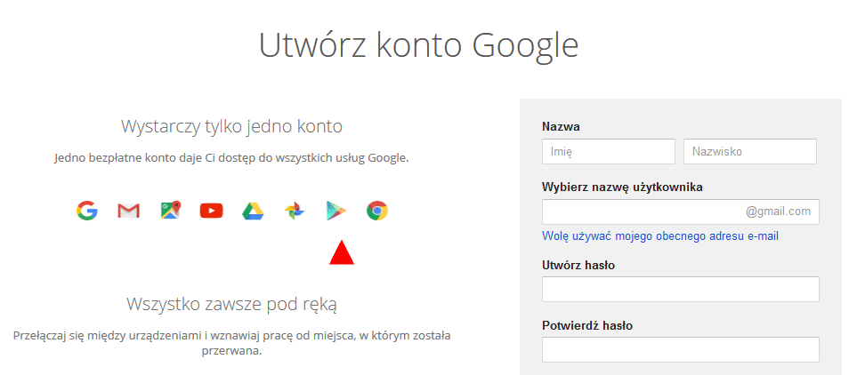 Aby uzyskać dostęp do opisywanego narzędzia, konieczne jest posiadanie adresu email, będącego kontem Google. Można to zrobić w dwojaki sposób: poprzez założenie nowego konta i uzyskanie adresu email w domenie gmail.com lub utworzenie konta Google podpiętego pod swój obecny adres email.