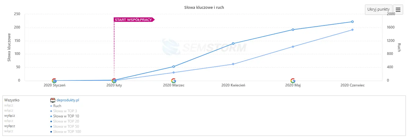 Poza działaniami związanymi z publikacją odnośników brandowych, w oparciu o osiągane efekty ustaliliśmy również kampanię link buildingu obejmującą linki na konkretne frazy. Dzięki niej uzyskane efekty będą trwalsze, a pozycje pozostałych wyrażeń, o których miejsce w TOP 10 nadal walczymy, są bliżej tej 10-tki niż kiedykolwiek wcześniej. I cały czas rosną.