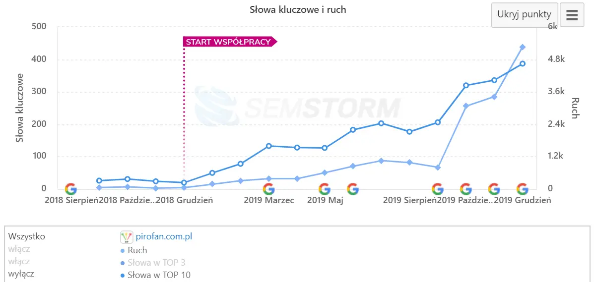 Dzięki odpowiednio dobranej strategii promocji witryny rankinguje ona na 387 słów kluczowych w TOP 10 wyników Google.